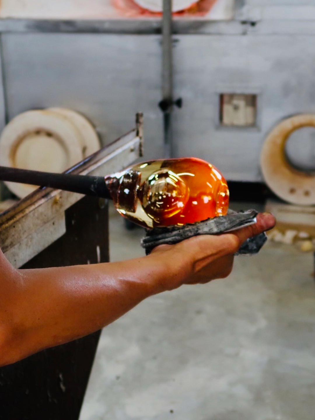 PRATO PINO often receive compliments about the quality of the glass. "We put considerable effort into achieving beautiful glass melting processes... within this, there are inevitably glass scraps that emerge during production. We carefully sort and collect these scraps, melting them down to create recycled green glass. It's a production limited to a certain time each year, and we experiment to incorporate these materials effectively into our pieces", explains Mika.