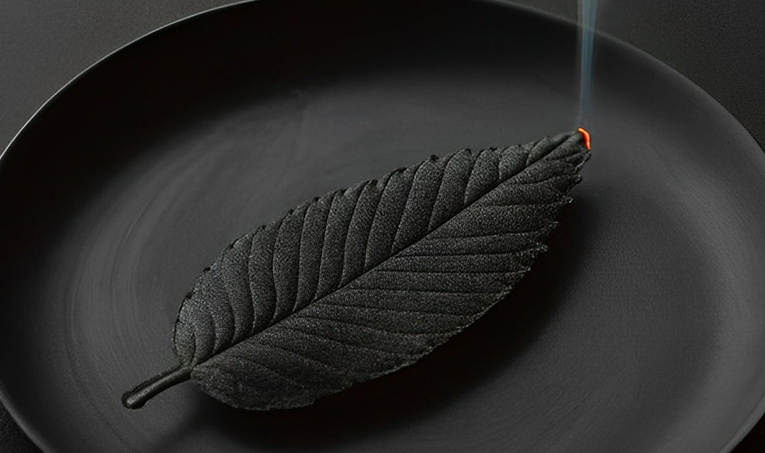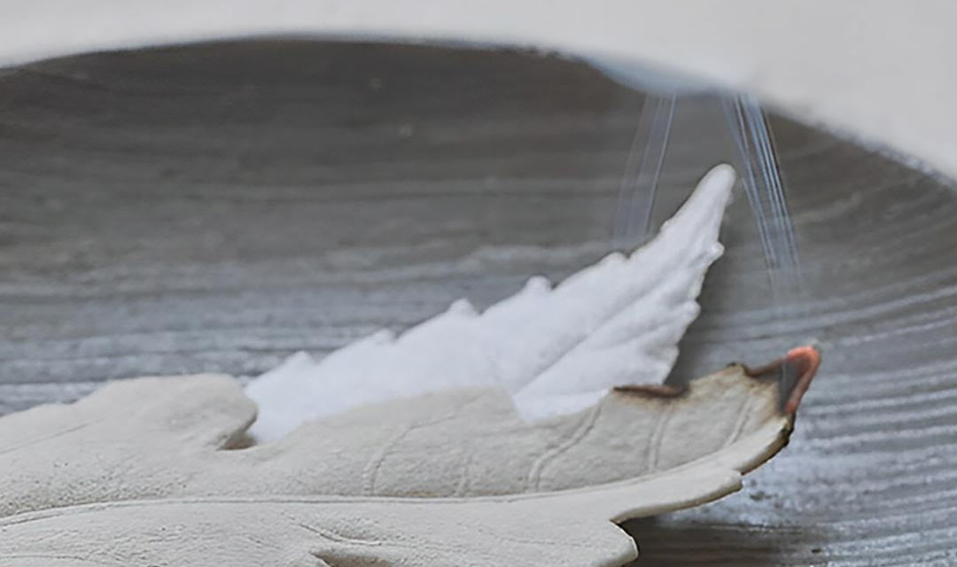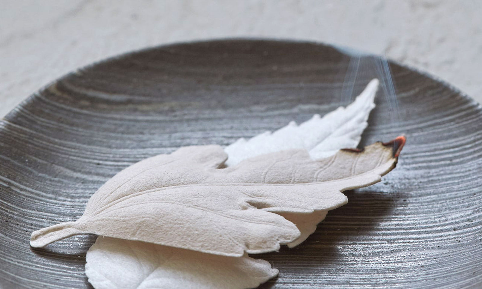 After lighting a HA KO leaf at the tip, carefully extinguish the small flame. Set it down on the provided non-flammable felt, on your favourite ceramic plate or the one provided. Each leaf burns up to 7 minutes, releasing a delightful scent that will fill your surrounding space.