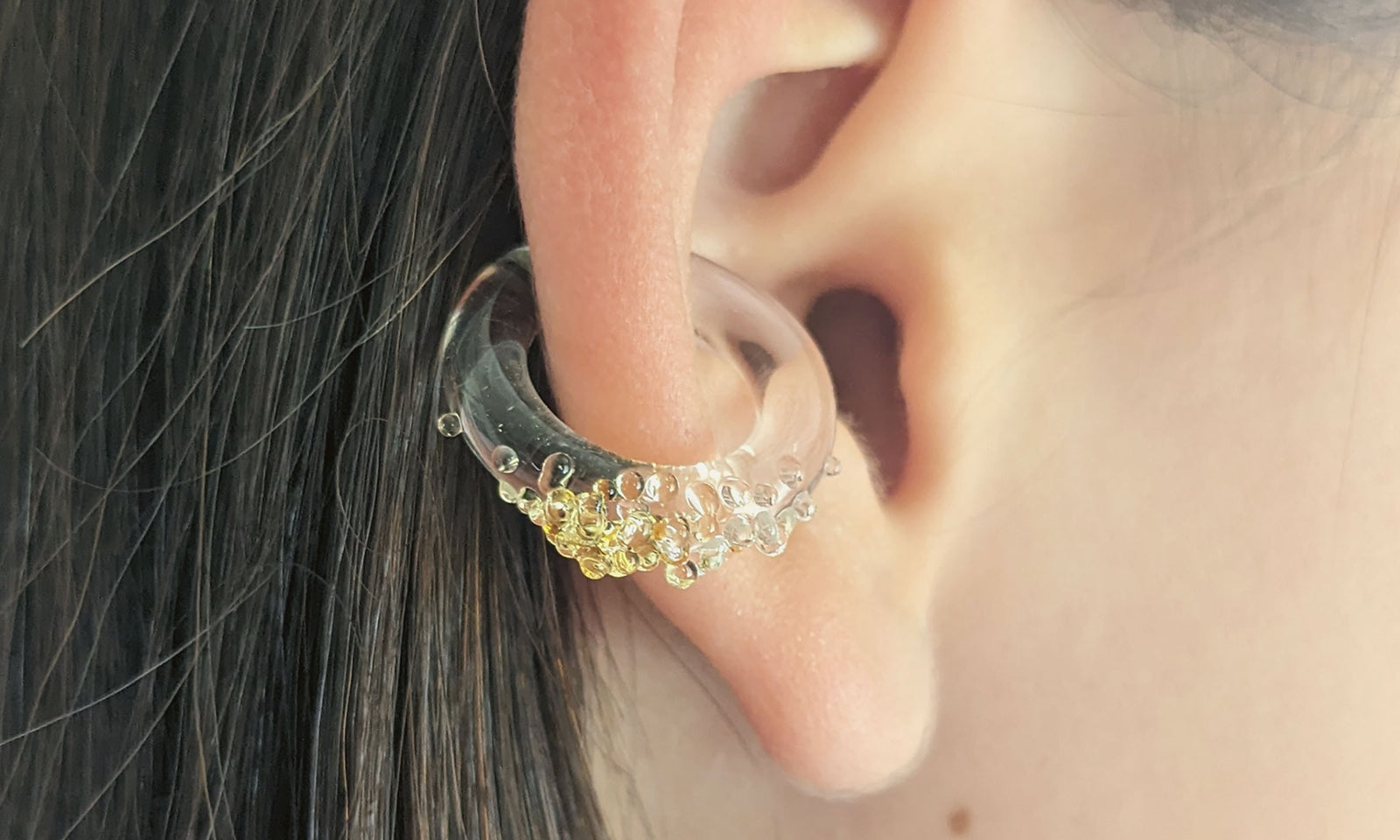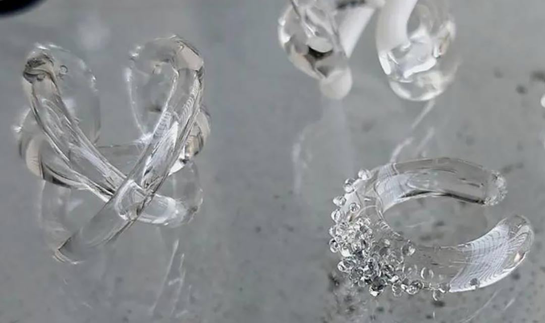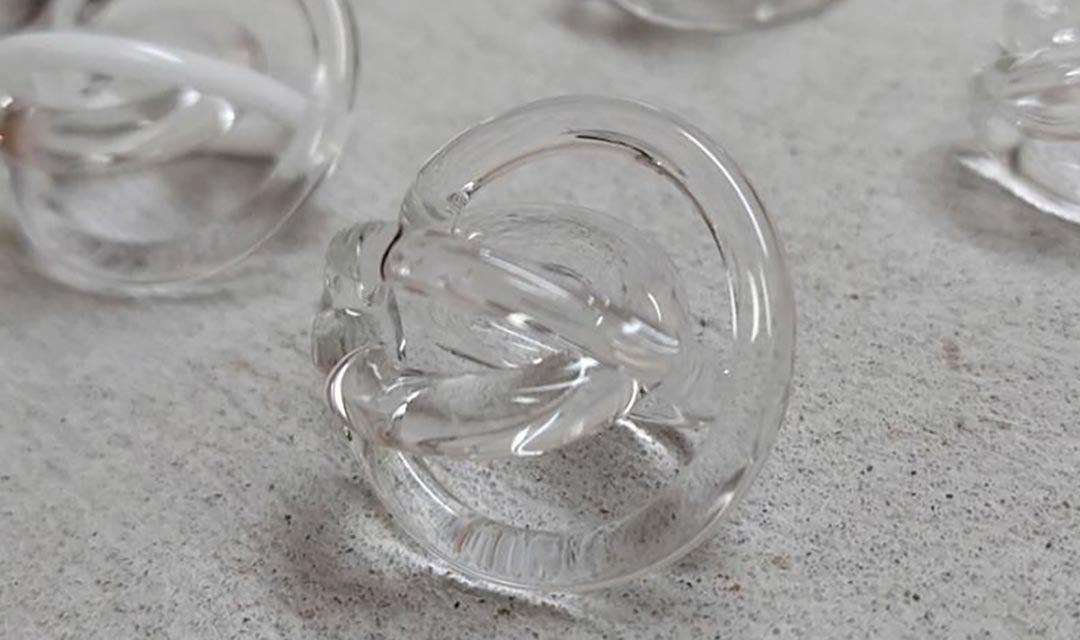 The transparency of the glass in combination with the spherical form of the ball creates a strong visual effect when light hits it, to elevate any elegant outfit.